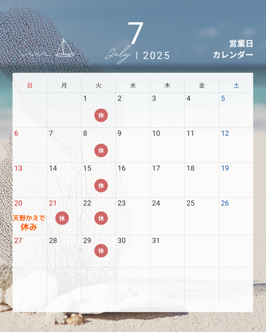 7月お休み 2025/07/02 7月休みのお知らせ 猛暑日が続いてますが体調お気を付けください 7がつのお休みは 火曜日・第三月曜日です。 〈スタッフ個人〉 20日(日曜)天野かえで ※急遽お休みになったり時短営業になる事もございます。ご了承ください!