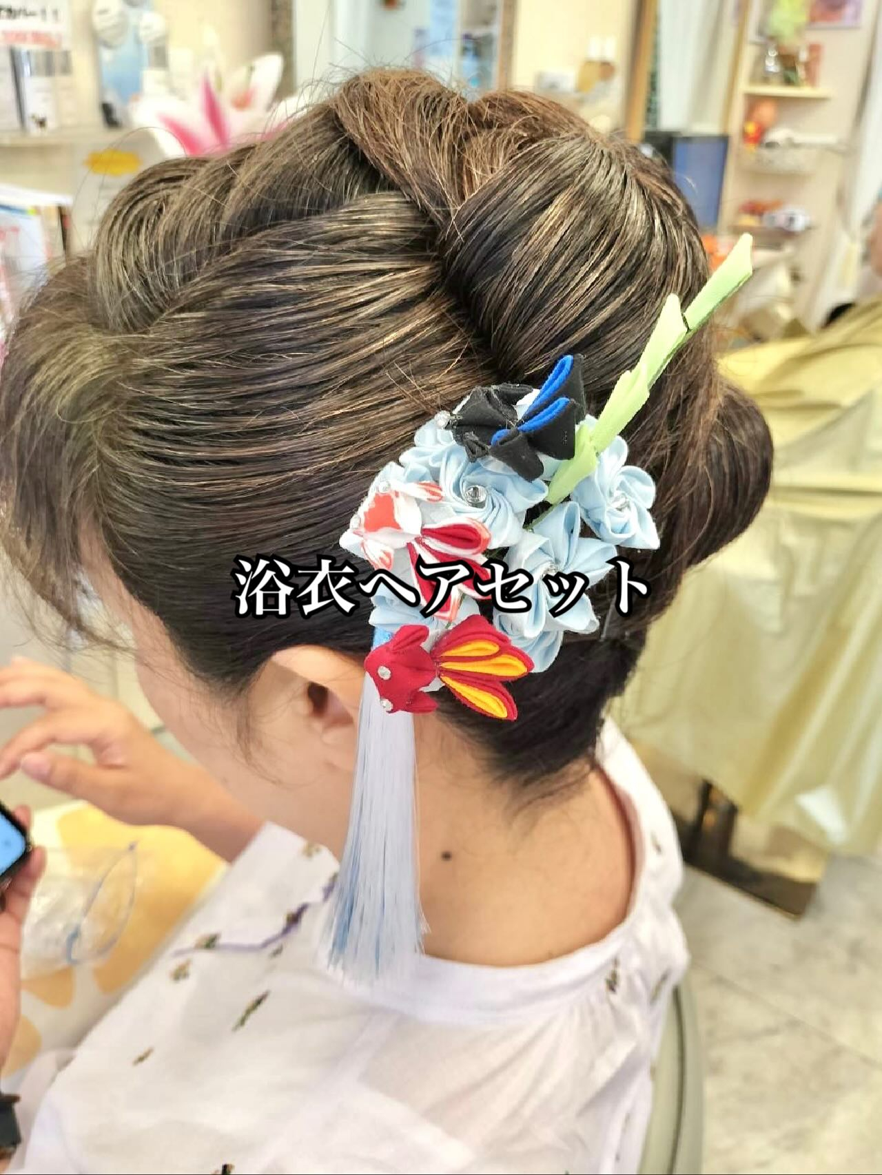 【篠崎】お祭り行く前にヘアセット! 【篠崎】お祭り行く前にヘアセット!お客様が持ってきた髪飾りがとても可愛い!つまみ細工の金魚🫧担当:緑[営業時間]9:30~18:00[定休日]毎週火曜日第三月曜日その他休みは随時ブログやホームページに…